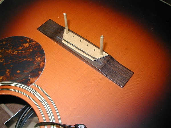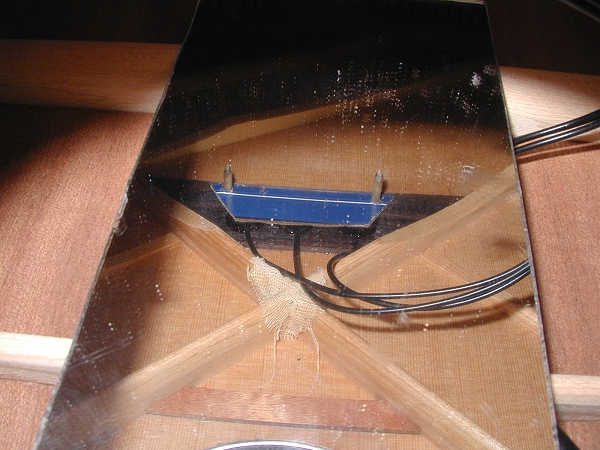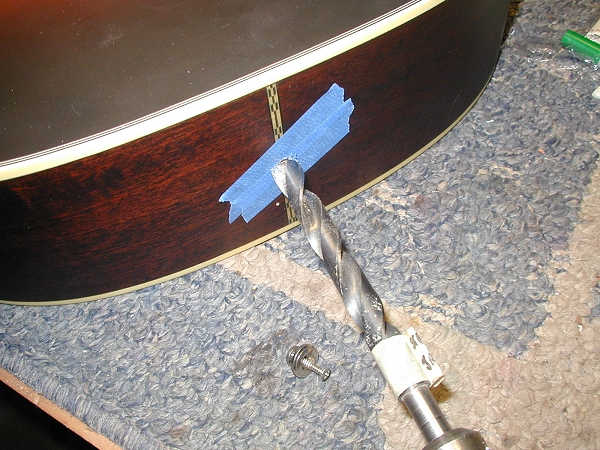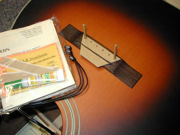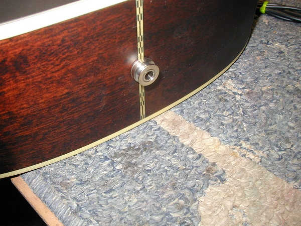 K&K Pure Western Mini Acoustic Installation www.KKSound.com Rob DiStefano - FretTech Guitars & Cavalier Pickups The EF-500MVS Epiphone Masterbilt. ![]() We'll start by drilling out for the strap jack - first, remove the lower strap button. ![]() Apply masking tape over the strap button's screw hole and punch through the tape at the hole. ![]() Using a variable speed hand electric drill with a sharp 1/2" bit that you know will cut properly into hardwoods, slowly drill out for the strap jack - check to make sure you're drilling as close to 90 degrees to the guitar body as possible. I've been installing strap jacks this way for decades and it's second nature for me to use a hand drill and free-hand drill out strap jack holes. Alternatively, you could start the hole with a smaller drill bit and use progressively larger diameter bits 'til you finish up with 1/2", and/or jury rig a drill press to aid in the operation. Testing out your drill bit on a scrap wood block or board before attempting to do so on your guitar is a very very wise idea. If you have doubts about your own drilling skills and/or tools, get a pro to drill your guitar's butt hole. ![]() All done - the masking tape keeps the hole edges tidy. ![]() The K&K Pure Western Mini transducers w/attached strapjack, including a bag with double stick tape (NOTE: as of 2015, K&K no longer supplies a tube of super glue). ![]() Cut out a 3" x 1-1/4" rectangle of cardboard - I've cut mine out from the USPS Priority Mail box that the K&K was shipped in - and on one long edge mark in 3/4" from each side and cut off, forming a trapezoid. ![]() With a pencil, mark about 1/4" in on the long side of the cardboard the string hole spacing by lining up the cardboard to the string holes. ![]() Poke pencil holes only in the outer E string marks. ![]() Using a 1/8" dowel or bamboo BBQ skewer, cut off two 2" long posts and poke each into a jig E hole, leaving about 1/2" poking thru. ![]() ![]() ![]() Test fit the jig by placing it into the sound hole and poke the posts up thru the E string peg holes. You wanna make sure that the cardboard template will sit flush to the bridge plate - if it doesn't, no problem, just trim off the cardboard 'til it sits flush to the plate. For the most part, it'll work fine as is. ![]() Put the jig back on top of the guitar and into the E string holes. Draw a line on the cardboard template that corresponds to where the saddle lies. You can cut off any excess cardboard that extends over the bridge (see next image). ![]() Using the K&K supplied double stick tape, take one tape and cut off a 3/16" strip. ![]() Peel off one side of the double stick tape and lay the tape down directly over the cardboard jig's saddle line. ![]() Snip off the excess tape ends. ![]() Remove the top film layer off the double stick tape, revealing the sticky side and trim off the cardboard within about 1/8" of the black saddle line that you marked on the cardboard jig. ![]() With the gold foil side of the transducers facing UP, place each transducer down on top of the double stick tape, on the center of the saddle line, with each transducer situated about in the middle of each pair of string holes. NOTE: K&K Sound now recommends placing the B/E transducer closer to, or directly over the high E string plate hole, to augment the the treble ... ![]() ![]() Clean each transducer foil with a clean paper towel - naphtha (lighter fluid) is a good cleaning agent. Also, using naphtha on a piece of paper towel, clean the area on the bridge plate (inside the guitar) where the transducers will get glued. Apply a generous amount of superglue to each gold foil. NOTE: before opening up a tube of superglue (CYA) near your beloved guitar, do what I didn't do and cover the entire guitar top with plastic food wrap film or painter's low tack masking tape, cut out for the sound hole and poke through at the bridge E string holes. You wouldn't wanna take a chance of dripping that nasty goop on yer guitar top! ![]() Lower the jig into the sound hole and push the posts up thru the E string holes, press the jig onto the bridge plate and hold for a good 30 seconds. Wait at least five more minutes for the goop to set up hard. ![]() ![]() Pull out the jig dowel posts, get your hand into the sound hole and carefully peel away the cardboard jig. The strip of double stick tape may or may not remain on the cardboard - either leave or wait a half hour or so for the superglue to fully cure and then peel off the tape. Most importantly, you can see the each transducer is perfectly located. You can see in this image that I peeled off the double stick tape and it also pulled off one of the logo decals on the far right transducer - no big deal. ![]() Run a wire (a plain G string works fine) through the 1/2" strap jack hole, put a slight 3/16" bend on the inside end and hook it onto one of the strap jack end holes. Using this jack "fish" wire, pull the jack through the guitar's strap jack body hole. Adjust the jack's body length for the best fit on your acoustic - this may mean test fitting the jack several times after adjusting the body length. When the fit is right, lock it on *tight*. ![]() All done! ![]() |