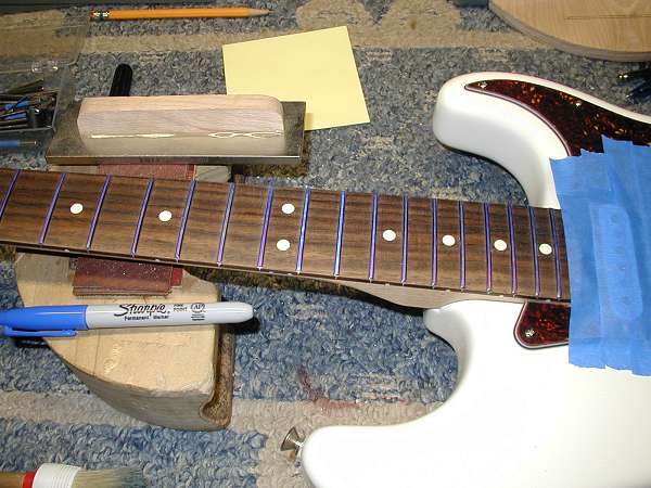 Jeff W's nice new MIM Strat has several areas of low frets that require leveling to remove string buzzing and allow for better overall playability. I removed the strings, leveled the fingerboard (via the truss rod), taped off the headstock nut area and upper body area, colored the fret tops with a Sharpie pen, and began leveling the frets with a special fret level file.