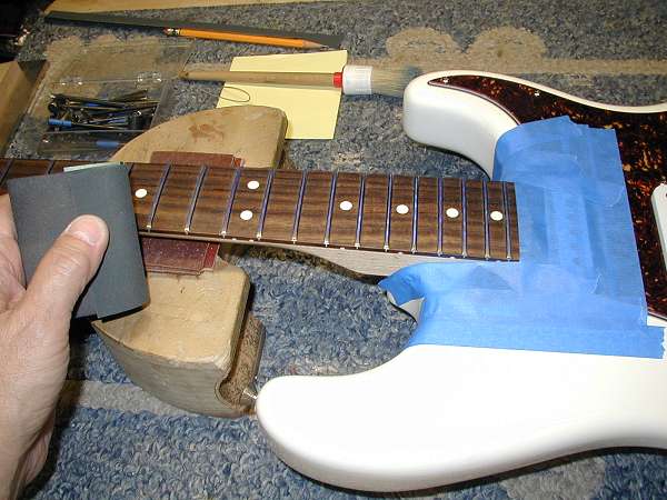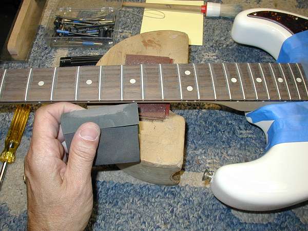 A block of neoprene rubber has one rounded edge wrapped in MicroMesh cloth, from 1500 through 12000 grits, to round the very fret top crowns and polish them uniformly smooth.