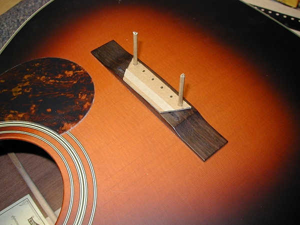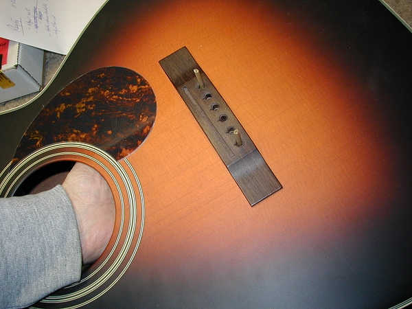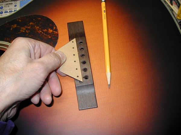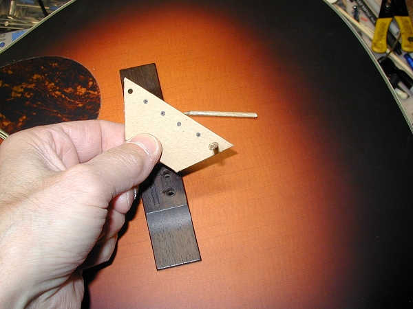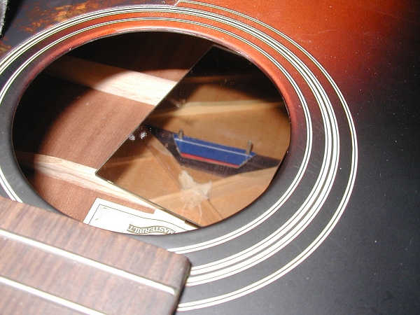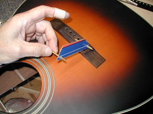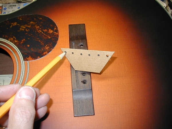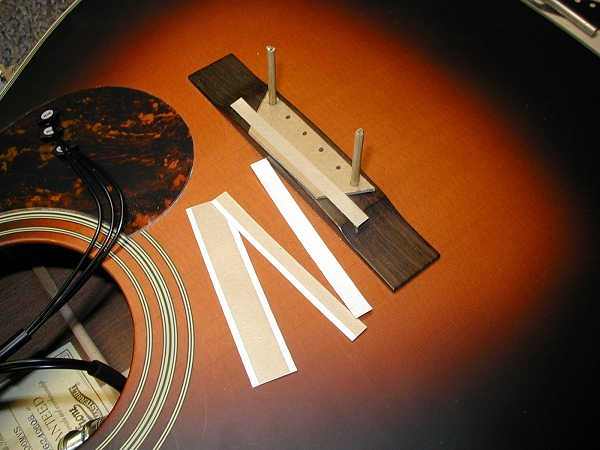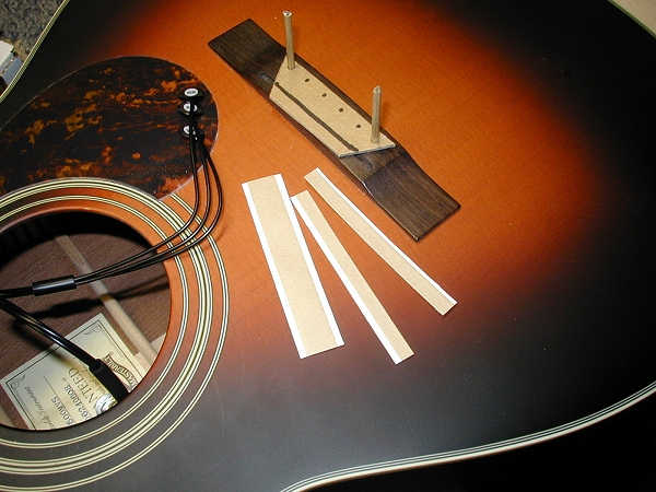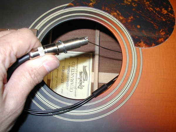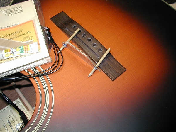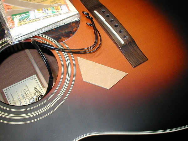 K&K Pure Western Mini Acoustic Installation www.KKSound.com Rob DiStefano - FretTech Guitars & Cavalier Pickups The EF-500MVS Epiphone Masterbilt. ![]() We'll start by drilling out for the strap jack - first, remove the lower strap button. ![]() Apply masking tape over the strap button's screw hole and punch through the tape at the hole. ![]() Using a variable speed hand electric drill with a sharp 1/2" bit that you know will cut properly into hardwoods, slowly drill out for the strap jack - check to make sure you're drilling as close to 90 degrees to the guitar body as possible. I've been installing strap jacks this way for decades and it's second nature for me to use a hand drill and free-hand drill out strap jack holes. Alternatively, you could start the hole with a smaller drill bit and use progressively larger diameter bits 'til you finish up with 1/2", and/or jury rig a drill press to aid in the operation. Testing out your drill bit on a scrap wood block or board before attempting to do so on your guitar is a very very wise idea. If you have doubts about your own drilling skills and/or tools, get a pro to drill your guitar's butt hole. ![]() All done - the masking tape keeps the hole edges tidy. ![]() The K&K Pure Western Mini transducers w/attached strapjack, including a bag with double stick tape (NOTE: as of 2015, K&K no longer supplies a tube of super glue). ![]() Cut out a 3" x 1-1/4" rectangle of cardboard - I've cut mine out from the USPS Priority Mail box that the K&K was shipped in - and on one long edge mark in 3/4" from each side and cut off, forming a trapezoid. ![]() With a pencil, mark about 1/4" in on the long side of the cardboard the string hole spacing by lining up the cardboard to the string holes. ![]() Poke pencil holes only in the outer E string marks. ![]() Using a 1/8" dowel or bamboo BBQ skewer, cut off two 2" long posts and poke each into a jig E hole, leaving about 1/2" poking thru. ![]() ![]() ![]() Test fit the jig by placing it into the sound hole and poke the posts up thru the E string peg holes. You wanna make sure that the cardboard template will sit flush to the bridge plate - if it doesn't, no problem, just trim off the cardboard 'til it sits flush to the plate. For the most part, it'll work fine as is. ![]() Put the jig back on top of the guitar and into the E string holes. Draw a line on the cardboard template that corresponds to where the saddle lies. You can cut off any excess cardboard that extends over the bridge (see next image). ![]() Using the K&K supplied double stick tape, take one tape and cut off a 3/16" strip. ![]() Peel off one side of the double stick tape and lay the tape down directly over the cardboard jig's saddle line. ![]() Snip off the excess tape ends. ![]() Remove the top film layer off the double stick tape, revealing the sticky side and trim off the cardboard within about 1/8" of the black saddle line that you marked on the cardboard jig. ![]() With the gold foil side of the transducers facing UP, place each transducer down on top of the double stick tape, on the center of the saddle line, with each transducer situated about in the middle of each pair of string holes. NOTE: K&K Sound now recommends placing the B/E transducer closer to, or directly over the high E string plate hole, to augment the the treble ... ![]() ![]() Clean each transducer foil with a clean paper towel - naphtha (lighter fluid) is a good cleaning agent. Also, using naphtha on a piece of paper towel, clean the area on the bridge plate (inside the guitar) where the transducers will get glued. Apply a generous amount of superglue to each gold foil. NOTE: before opening up a tube of superglue (CYA) near your beloved guitar, do what I didn't do and cover the entire guitar top with plastic food wrap film or painter's low tack masking tape, cut out for the sound hole and poke through at the bridge E string holes. You wouldn't wanna take a chance of dripping that nasty goop on yer guitar top! ![]() Lower the jig into the sound hole and push the posts up thru the E string holes, press the jig onto the bridge plate and hold for a good 30 seconds. Wait at least five more minutes for the goop to set up hard. ![]() ![]() Pull out the jig dowel posts, get your hand into the sound hole and carefully peel away the cardboard jig. The strip of double stick tape may or may not remain on the cardboard - either leave or wait a half hour or so for the superglue to fully cure and then peel off the tape. Most importantly, you can see the each transducer is perfectly located. You can see in this image that I peeled off the double stick tape and it also pulled off one of the logo decals on the far right transducer - no big deal. ![]() Run a wire (a plain G string works fine) through the 1/2" strap jack hole, put a slight 3/16" bend on the inside end and hook it onto one of the strap jack end holes. Using this jack "fish" wire, pull the jack through the guitar's strap jack body hole. Adjust the jack's body length for the best fit on your acoustic - this may mean test fitting the jack several times after adjusting the body length. When the fit is right, lock it on *tight*. ![]() All done! ![]() |
