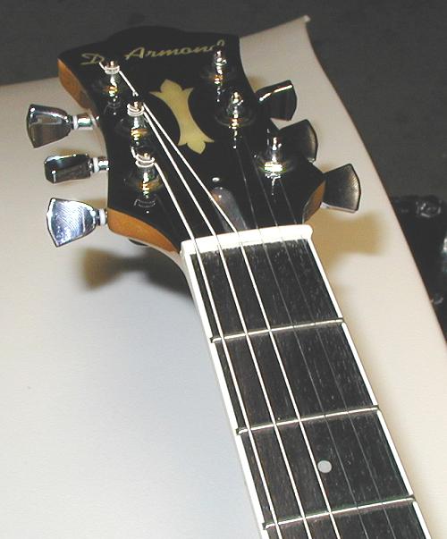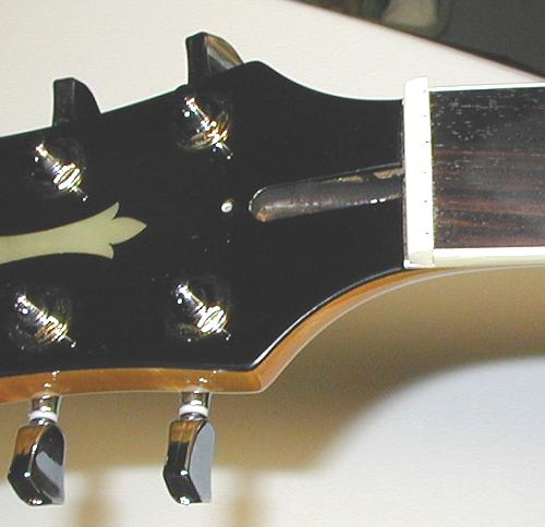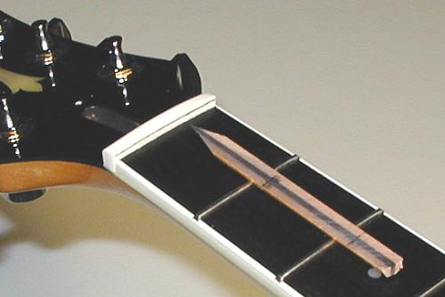 New rough nut blank placed (NOT glued) in place. If you look REAL close, you'll see the pencil marks for the string spacing - I used a special Stew-Mac graduated nut slot spacing template.
