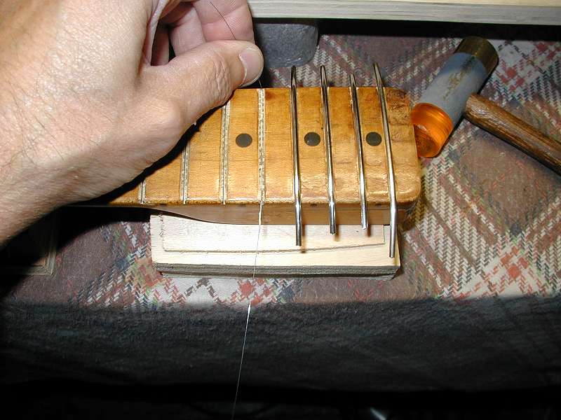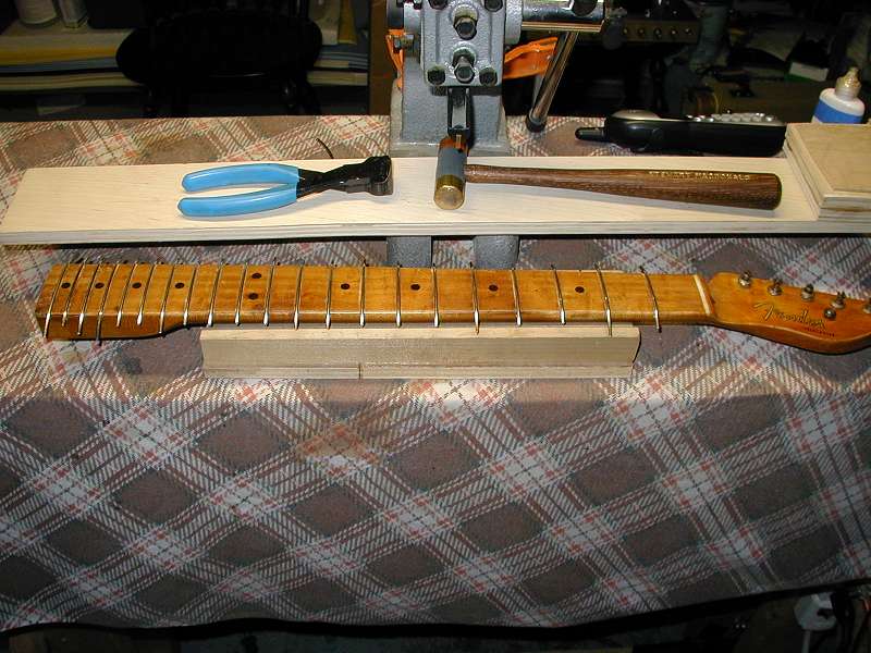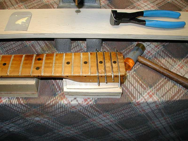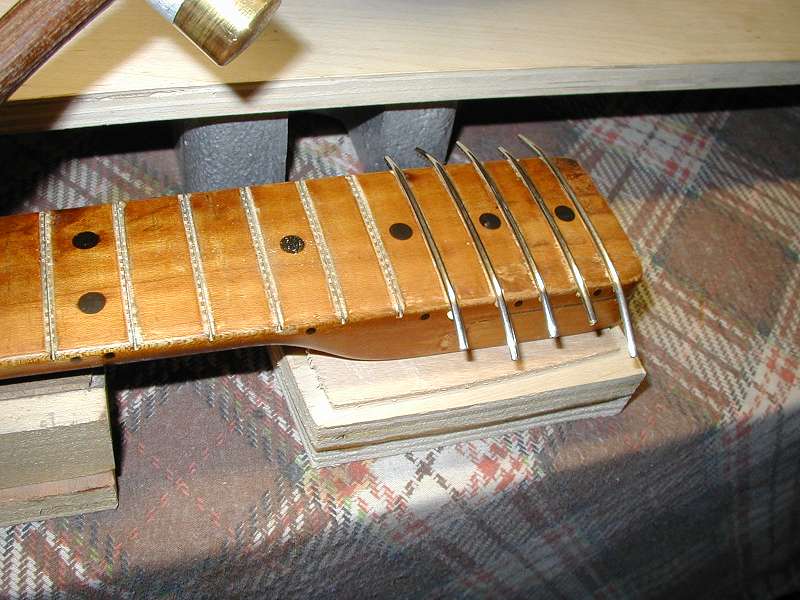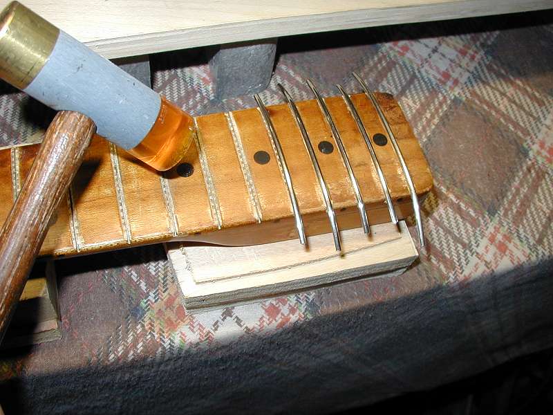 The neck is removed from the arbor press and the fret ends are tapped down.