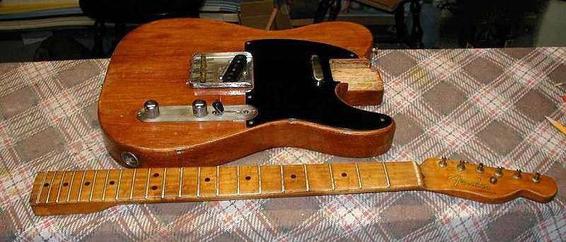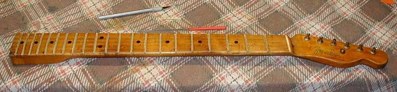 Rich's '52 Tele, slightly in pieces. It appears as if the both the body and neck were refinished, and at least one refret was accomplished. Those old frets averaged .080" x .020" - definitely time for a refret!