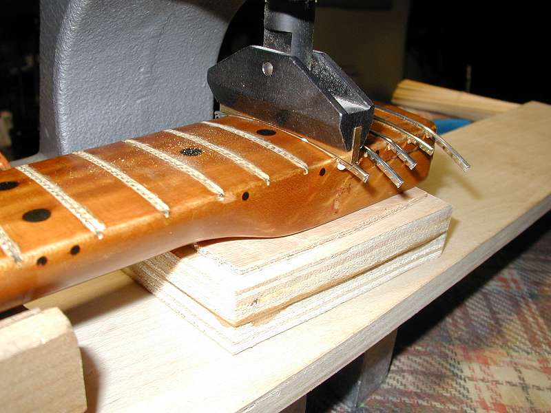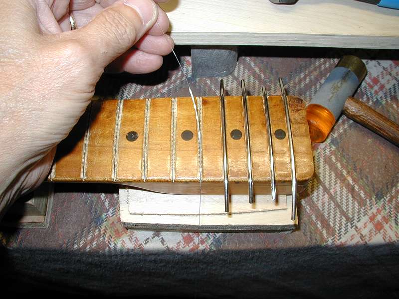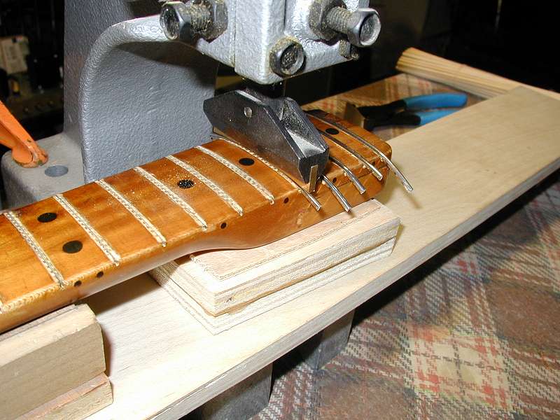 Rich elected to go with larger frets, and here's four .095" x .045" frets already installed with an arbor press.