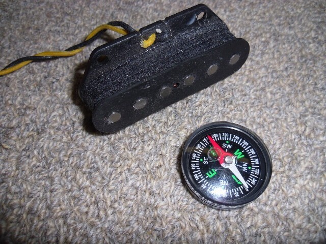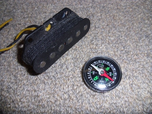You'll need a cheap magnetic compass and a neodyminum (rare earth) magnet, as shown in the images below. Big box stores like Home Depot sell a six pack of 1/2" rare earth magnets for about $9 - use the entire stack of magnets for charging pickup rod magnets. ![]() First, find out the top polarity of the pickup you wish to flip. the south compass needle points to the top of the pickup, so this Tele bridge bobbin is top magnetic NORTH ... ![]() Now to find the north side of the neo mag ... ![]() Touch the north side of the neo mag to the top of each of the six bobbin pole pieces for a few seconds each, from one side ... ![]() to the other ... ![]() And now that north top magnetic bobbin is now top magnetic SOUTH ...